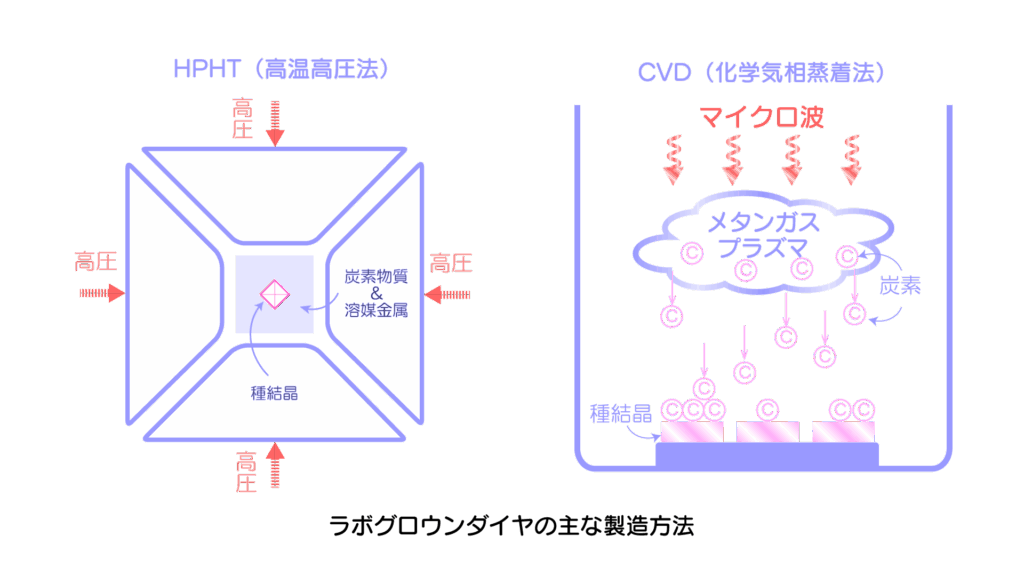 ラボグロウンダイヤは、天然ダイヤが地中で生成される環境を人工的に再現して作られます。主に2つの製法があります。