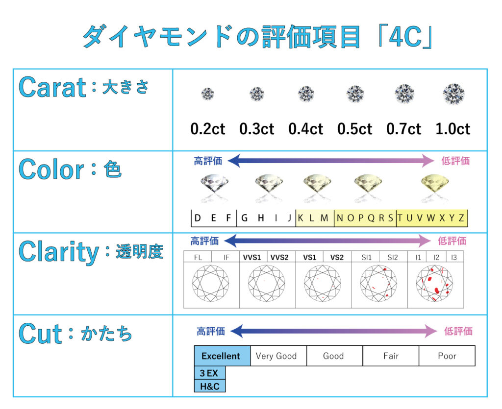 天然ダイヤの価値は、Carat(重さ)、Color(色)、Clarity(透明度)、Cut(輝き)の“4C”で評価されます。同じグレードでも、インクルージョン(内包物)の位置や光の反射具合によって価格が変わることもあります。まさに「世界に二つと同じものがない」存在です。